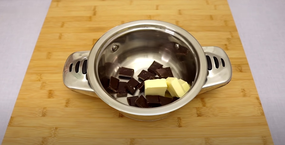 Mezitím si připravte glazuru z hořké čokolády a másla. Směs lze rozpustit například ve vodní lázni nebo v menším rendlíku se silnějším dnem.