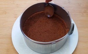 Do misky mixéru nalámejte kakaové sušenky a rozmixujte je na jemnou drť. Přesypejte ji do mísy, přilijte k ní rozpuštěné máslo a smíchejte do lepkavé, drobivé hmoty. Vezměte kus do hrsti a stiskněte ji dohromady. Pokud se okraj odlomí a odpadne, přidejte do těsta lžíci mléka, promíchejte a test opakujte i s případným přidáváním mléka, je-li třeba. Když je hmota dostatečně pevná, odeberte z ní asi jednu třetinu stranou a zbytek upěchujte do kroužku z dortové formy.