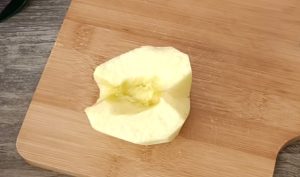Jablka oloupejte, rozkrojte na poloviny a vykrojte z nich stopky a jádřinec. Do mísy rozklepněte vejce, přidejte cukr, dvě lžíce oleje a vyšlehejte. Přidejte jogurt a znovu zašlehejte, poté totéž proveďte s vanilkovou pastou. Přimíchejte do směsi prosetou mouku a prášek do pečiva.