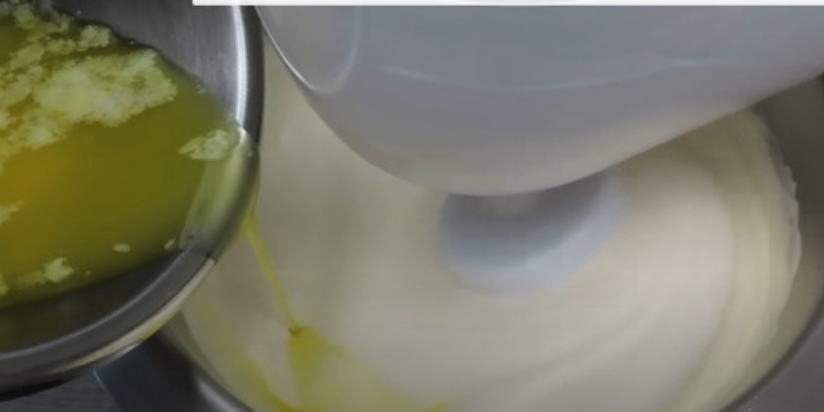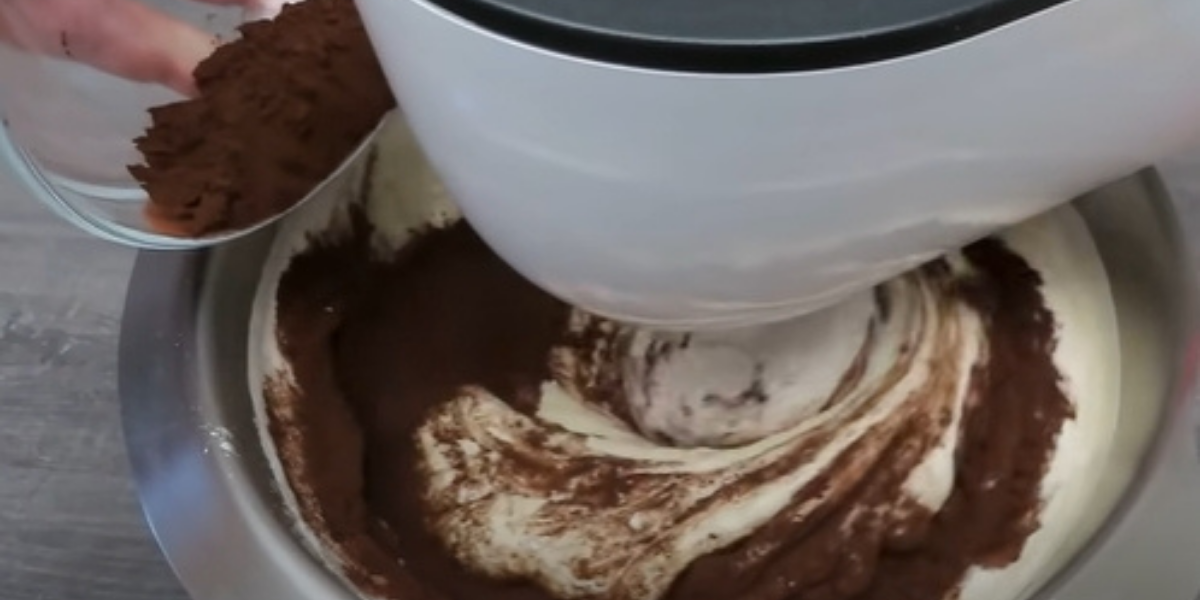 Máslo rozpusťte v mikrovlnné troubě nebo v kastrůlku na kamnech a přilijte ho tenkým pramínkem za stálého šlehání do bílkové hmoty. Nakonec vmíchejte také mléko, prášek do pečiva, kakao a nakonec mouku a nejnižší rychlostí míchejte, dokud nezískáte jednolité těsto.