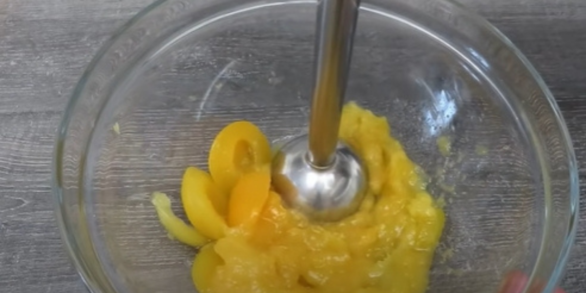 Do misky vložte meruňky a tyčovým mixérem je rozmixujte na homogenní pastu. Přidejte cukr a vanilkový cukr a znovu mixérem promíchejte. Nechte si stranou tři meruňky, které pokrájíte na plátky.