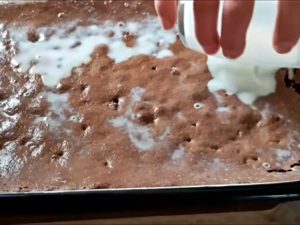 Dopečené těsto po celé ploše propíchejte špejlí a nalijte na něj 200 ml mléka, které rozlijte po jeho povrchu tak, aby se rovnoměrně vsáklo do korpusu.