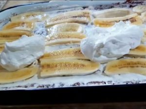 Plnotučnou smetanu, případně dva balíčky instantní smetany v prášku s 250 ml mléka vyšlehejte do tuhé pěny. Tenkou vrstvou šlehačky potřete korpus napuštěný mlékem. Oloupejte banány, zbavte je špiček a rozkrájejte je podélně na tenčí plátky, které vyskládejte po celé ploše potřeného korpusu. Na banány rozetřete zbytek šlehačky a uhlaďte ji do roviny. Takto připravený dort nechte v lednici asi půl hodiny vychladit a ztuhnout.