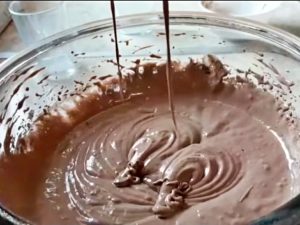 Do mísy vyklepněte čtyři vajíčka, přidejte k nim 200 gramů cukru a ručním šlehačem je vyšlehejte do hladkého a bělavého krému. Přilijte 3 lžíce mléka a přes jemné sítko prosejte do směsi hladkou mouku spolu s kakaem, práškem do pečiva a vanilkovým cukrem nebo esencí a vše znovu prošlehejte, abyste získali hladké a polotekuté těsto.