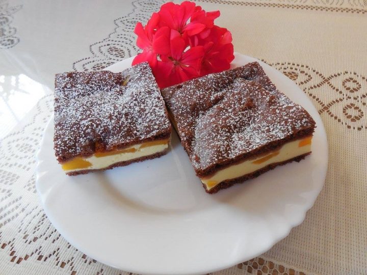 Kombinace řezů z kakaového těsta spolu s tvarohem a broskvemi je velmi lahodná. Jednoduchý recept na ně nám poskytla paní Dagmar Kazdová.