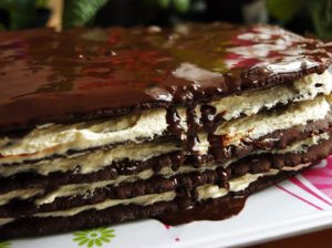 Naskládejte nakonec všechny na sebe a dort přelijte polevou z hořké čokolády a dvou lžic slunečnicového oleje.