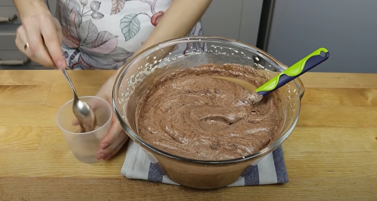 Začněte nejprve přípravou korpusu. V míse si vyšlehejte vejce spolu s krupicovým cukrem do pěny. Poté k směsi přidejte i kakaový prášek, polohrubou mouku, vodu, vanilkový cukr, špetku soli a vypracujte homogenní těsto polotekuté konzistence.