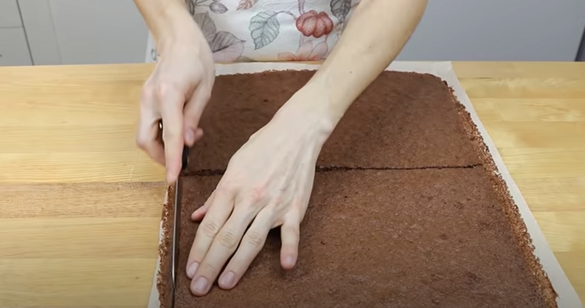 Nyní si k ruce vezměte upečený kakaový korpus a rozřízněte jej v polovině podélně.