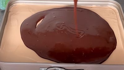 Krémem potřete povrch korpusu a dezert vložte na pár minut do lednice. Mezitím připravte polevu rozpuštěním rozlámané čokolády v horké smetaně. Polevou pokryjte vychlazený dezert a ještě 1 hodinu ho chlaďte.