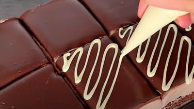Na závěr kakaový řez ozdobte rozpuštěnou bílou čokoládou a podávejte ho nakrájený na kousky.