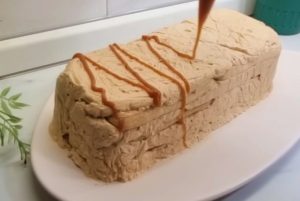 Poté naneste další vrstvu krému, opět piškoty v mléce a takto postup opakujte, dokud nedojdete až k vrchu dezertu, který zakončíte krémem. Poté jej zakryjte potravinářskou fólií. Dejte dezert na dvě hodiny zatuhnout do lednice, poté ho překlopte na talíř a dozdobte ho karamelovou polevou a vlašskými ořechy. Následně můžete dezert podávat, dobrou chuť!