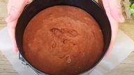 Těsto vložte do dortového ráfku, vyloženého pečicím papírem a pečte ho v předehřáté troubě na 180 °C po dobu 25–30 min. Po upečení korpus rozřízněte na tři stejné části a pokračujte s přípravou karamelu.