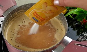 Karamel zalijte mlékem. Dejte přitom pozor, abyste se nepopálili, zpočátku bude horká směs hodně pěnit a prskat. Poté vlivem chladného mléka karamel mírně ztuhne, nedejte se tím však vyděsit, jakmile se mléko začne vařit, karamel se opět úplně rozpustí.