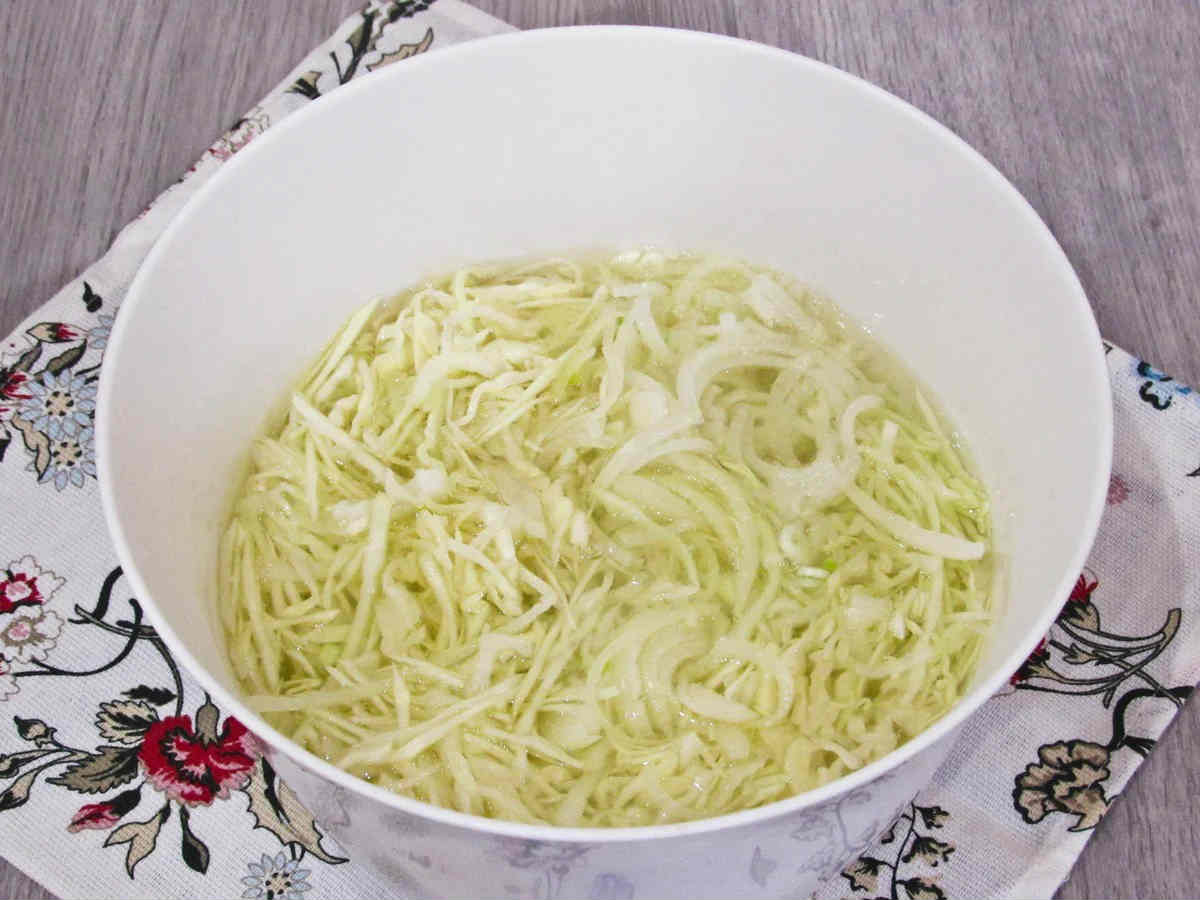 Nakrájejte cibuli a zelí, zalijte obojí vařící vodou a po dobu 5 minut vařte, aby zelenina změkla. Poté přeceďte, dobře ze zeleniny vytlačte vodu a dejte zpět do misky.