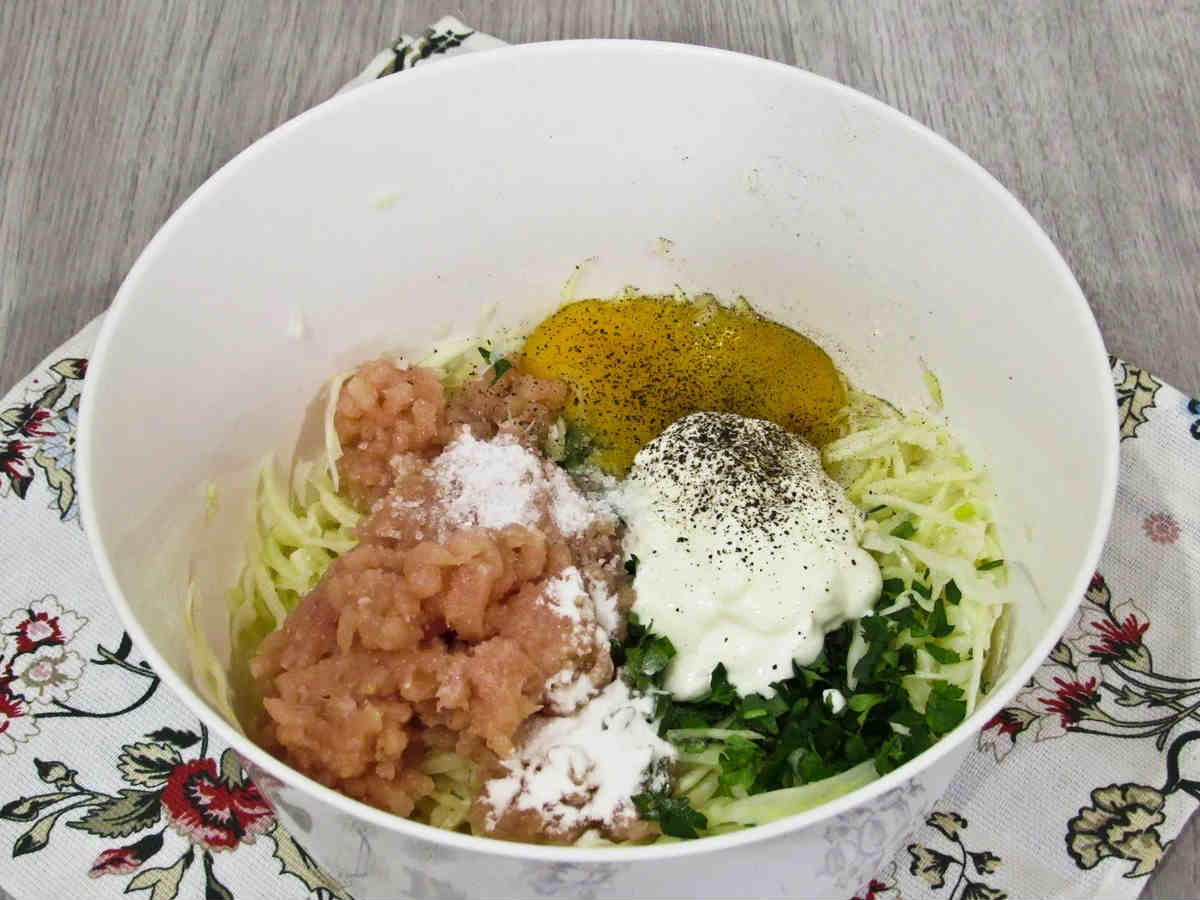 K zelenině přidejte mleté kuře, vejce, zakysanou smetanu a dochuťte kořením, solí a pepřem, dle vaší chuti.