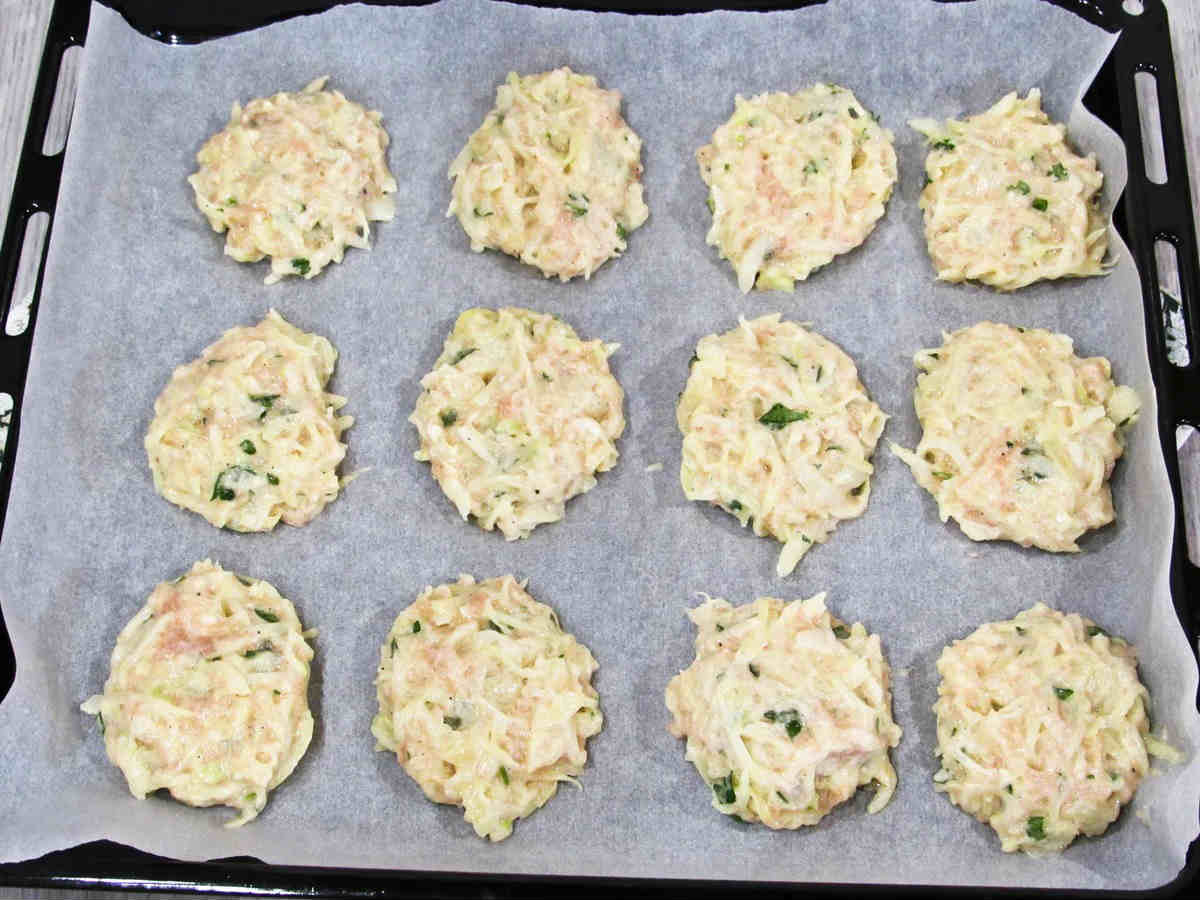 Plech vyložte pečicím papírem a ze směsi tvarujte karbanátky. Pečte při teplotě 190-200 ° C po dobu půl hodiny. Po upečení by měly být karbanátky na povrchu zlaté a křupavé a uvnitř hebké a šťavnaté.