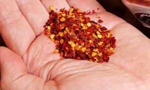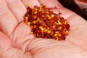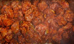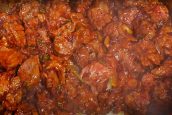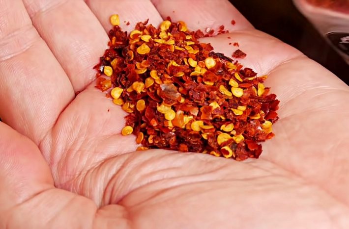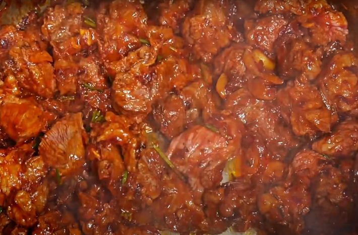 Do hrnce přidejte dvě polévkové lžíce sladké nebo pálivé papriky (podle toho, jak moc pálivé jídlo máte rádi) a za stálého míchání asi 1 minutu restujte. Dejte pozor, aby se nepřipálila, potom by zhořkla. Obsah hrnce zalijte vroucím hovězím vývarem a přidejte podle chuti chilli vločky. Vše důkladně promíchejte, přiklopte pokličkou a vařte, dokud maso zcela nezměkne.
