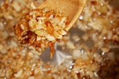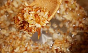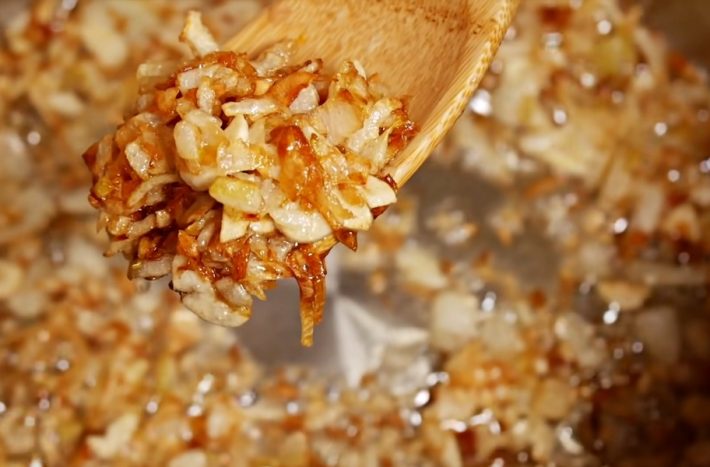 Šest stroužků česneku oloupejte a nakrájejte je nadrobno. V hrnci rozehřejte dvě polévkové lžíce sádla, vsypte do něj nasekanou cibuli a nechte ji zesklovatět. Přidejte česnek a spolu s cibulí ho restujte dozlatova.