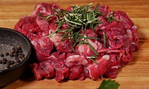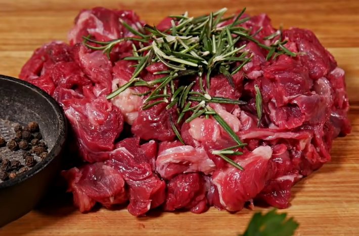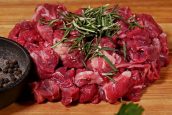Oloupejte tři cibule a nasekejte je nadrobno. Hovězí krk očistěte a nakrájejte ho na kostky. K masu přidejte čerstvě otrhané lístky rozmarýnu, malou hrstku sušeného tymiánu, trochu čerstvě mletého černého pepře a sůl.