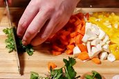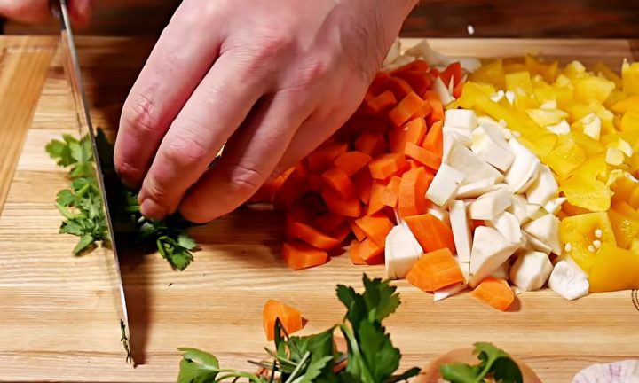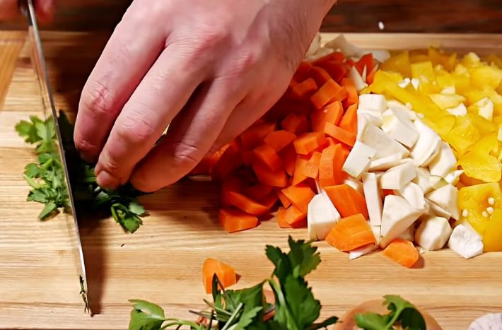 Mezitím nakrájejte na drobné kostičky dvě mrkve, čtyři menší petržele, čtvrtku malé bulvy celeru a jednu žlutou nebo červenou papriku. Z petrželky odkrojte tuhé stonky a lístky nasekejte nadrobno. Když je maso téměř měkké, kořenovou zeleninu vsypte do polévky a pokračujte ve vaření dalších 15 minut, dokud nezměkne.