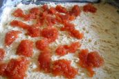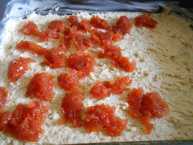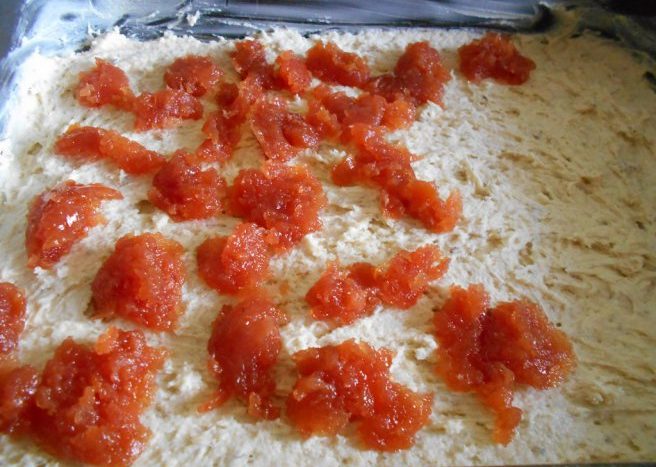 Dejte si stranou 1/5 těsta a přidejte do něj 3–4 lžíce mouky, aby bylo hustší a tužší. Tuto část těsta nastrouhejte na struhadle. Těsto ručně nebo lžící rozetřete rovnoměrně na plech vymazaný margarínem. Až ho budete mít vyrovnané, můžete ho potřít vrstvou džemu podle svého výběru. My jsme použili kdoulový, protože je příjemně sladký a zároveň trochu kyselý.