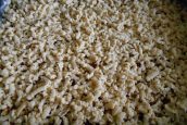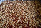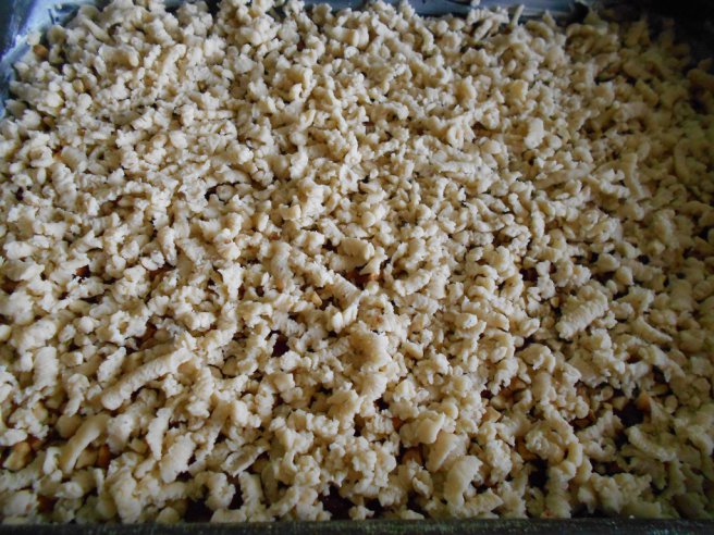 Na vrstvu džemu rozprostřete 100 gramů opražených a nahrubo nasekaných vlašských ořechů. Těstem, které jste nastrouhali na hrubém struhadle, posypejte vršek celého koláče. Takto připravený koláč vložte do trouby předehřáté na střední teplotu a pečte po dobu 30–35 minut.