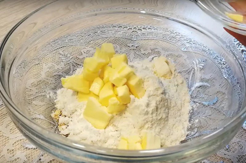 Ve vedlejší misce smíchejte tři polévkové lžíce ovesných vloček se stejným množstvím hladké mouky. Přidejte 40 gramů změklého másla, které předem pokrájejte na menší kostky, aby se s ním snáze pracovalo. Nyní rukama vše drťte a hněťte, dokud nezískáte moučnou písčitou drť.