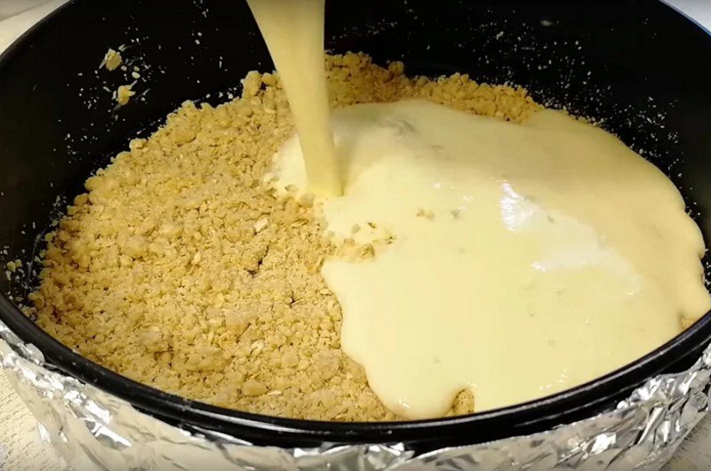 Připravte si dortovou formu, kterou vymažte máslem a dno vyložte pečicím papírem. Na dno rozložte moučkovou drť a dobře ji prsty upěchujte. Na ni nalijte vrstvu zakysané smetany.