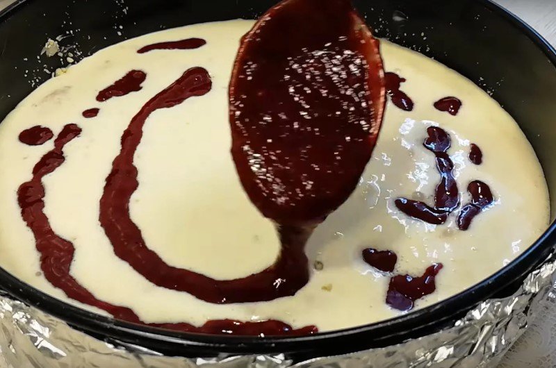 Polévkovou lžící pak naberte ovocné pyré a postříkejte jím povrch smetanové hmoty.