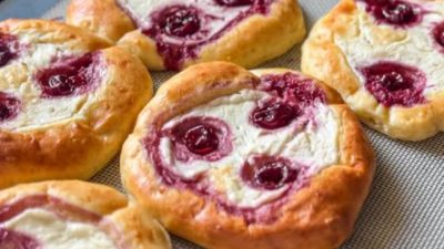 Poté připravte třešňovou náplň smícháním vypeckovaných třešní a škrobu. Následně odkryjte bochánky a pomocí dna sklenice v jejich středu vytvořte prohlubeň, kterou naplňte tvarohovou náplní a třešněmi.