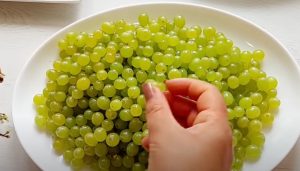 Hroznové víno, jedno jakého druhu, pečlivě omyjte. Je důležité, aby bylo opravdu čisté, proto oplachování několikrát zopakujte. Poté hrozny oberte na jednotlivé kuličky, všechny nějak poškozené nebo nahnilé plody odstraňte.
