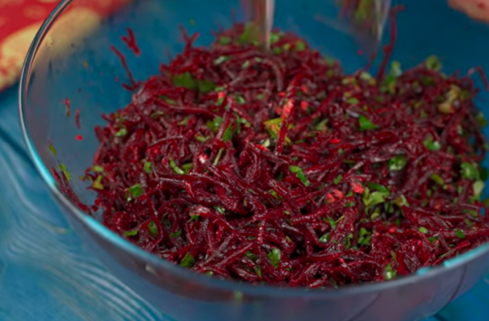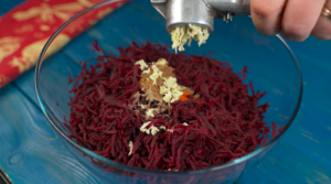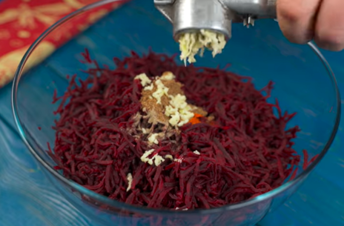 Červenou řepu oloupejte a nastrouhejte na struhadle na korejskou mrkev či spiralizérem. Nastrouhanou řepu osolte a rukou prohněťte. Po chvilce řepa pustí šťávu. Přemístěte ji do druhé misky, přičemž každou várku důkladně vyždímejte a vymačkejte. Vysušenou řepu posypejte mletým černým pepřem, červenou paprikou, drceným koriandrem a přidejte také prolisované stroužky česneku.