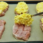 Marinované kotlety následně vyskládejte na plech s pečícím papírem a pusťte se do sýrové směsi k zapékání.