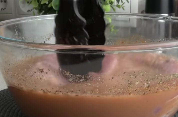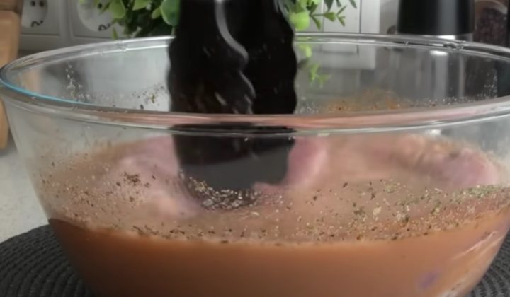 Kotletu nakrájejte na 6 plátků asi 1,5 centimetru silných a z obou stran je naklepejte. Dejte je do mísy a přilijte perlivou vodu. Přidejte sůl, provensálské bylinky, sladkou papriku, sušený česnek, pepř a mléko. Promíchejte, zakryjte a nechte maso hodinu marinovat.