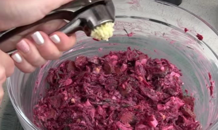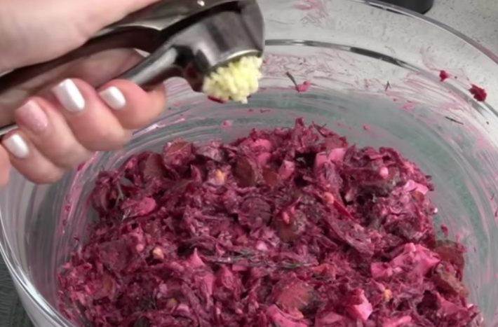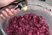 Na salát si dejte dopředu vařit vejce na tvrdo, aby stihla vychladnout, a také si uvařte nebo upečte červenou řepu. Tu nastrouhejte na hrubém struhadle, dále nakrájejte kyselé okurky na hrubší kolečka, vařená vejce na kostičky a dejte vše do mísy. Můžete přidat i nasekaný kopr, pokud ho máte rádi.