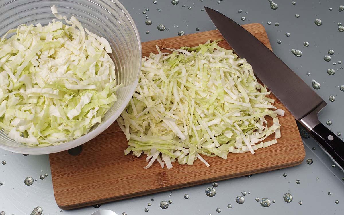 V první fázi si omyjte hlávku bílého zelí a nakrájejte ji na tenké nudličky. Zelí je však možné nakrouhat i na struhadle.