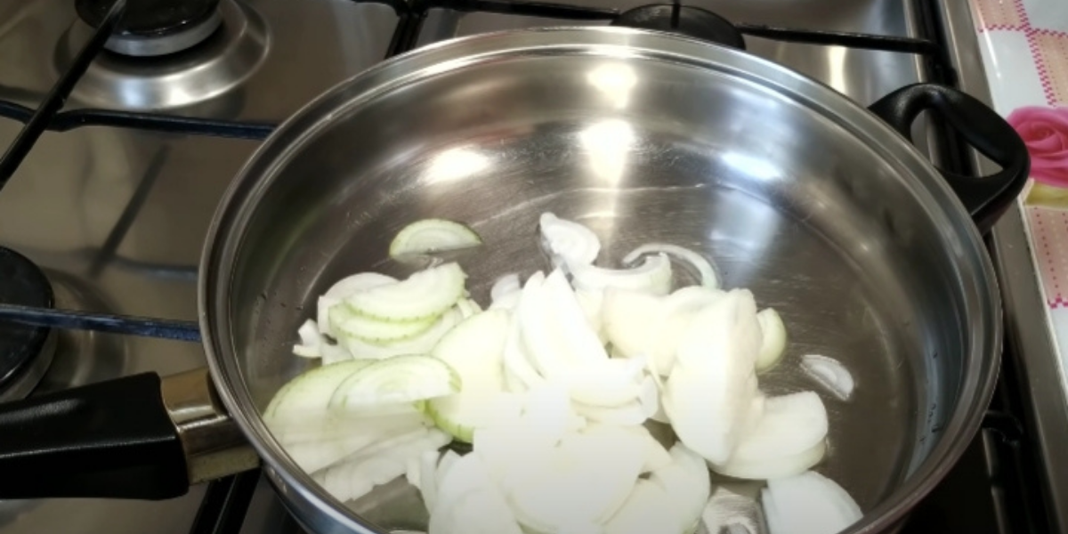 Na kamnech rozehřejte pánev s trochou oleje. Když je horký, ztlumte oheň na střední úroveň a vhoďte na něj pokrájenou cibuli, kterou smažte dozlatova.