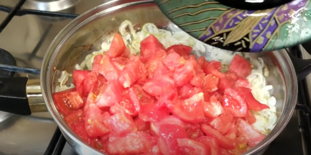 Oloupaná rajčata pak pokrájejte na větší kousky a přihoďte je do pánve k cibuli. Dobře promíchejte, přiklopte pokličkou a vařte asi 5 minut.