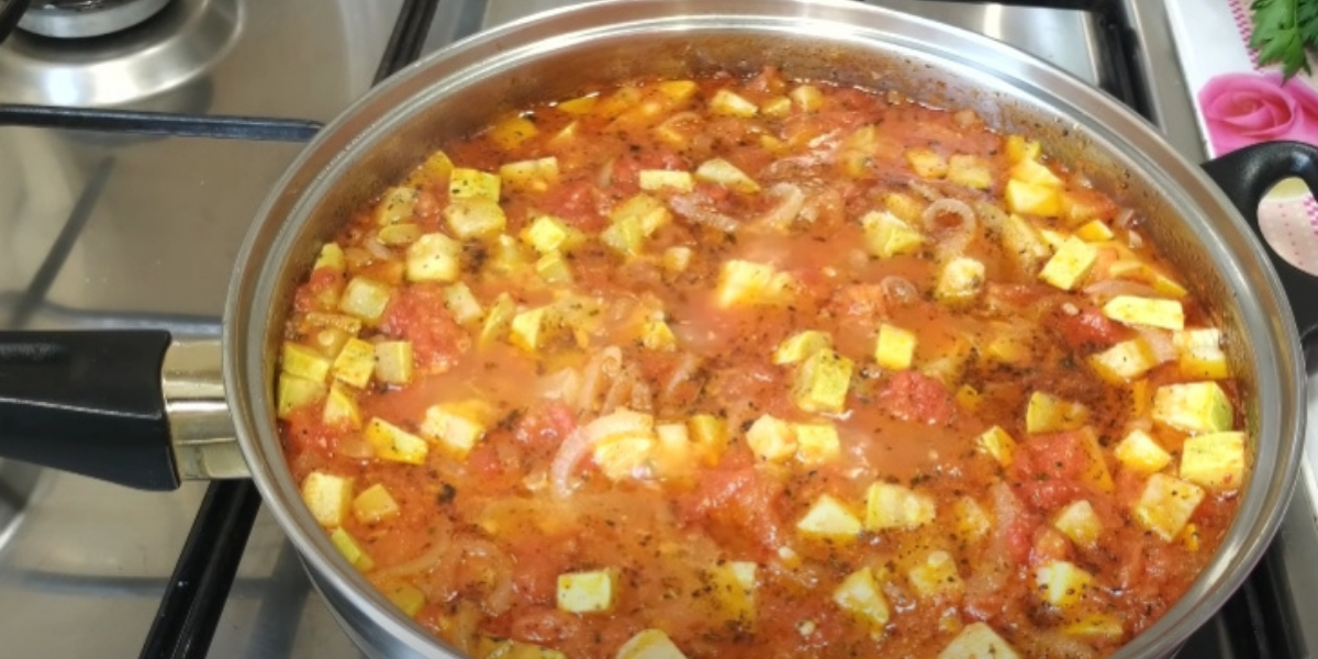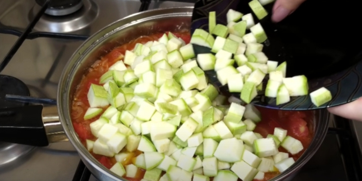 Zatímco se rajčata dusí, omyjte mladé cukety, odstraňte z nich obě špičky a dužninu pokrájejte na středně velké kostky. Ty pak vhoďte do pánve k cibuli a rajčatům a promíchejte. Znovu zakryjte pokličkou a dále duste asi 10 minut.