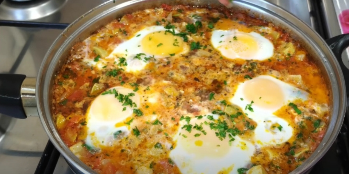 V tu chvíli směs zasypejte čerstvě nasekanou petrželkou a vyklepněte do pánve pět vajec, aniž byste je  promíchali, přiklopte pokličkou a nechte další 2 až 3 minuty povařit, aby bílek ztuhl, ale žloutek zůstal tekutý.