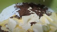 Začněte s přípravou korpusu. Mouku smíchejte s vaječnými žloutky, cukrem, smetanou, kypřicím práškem do pečiva a kakaem.