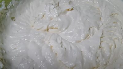Za stálého šlehání postupně přidejte bílý sýr a poté vanilkový pudink v prášku. Poté do směsi opatrně vmíchejte vyšlehaný sníh.