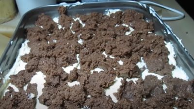 Polovinu vychlazeného těsta rozprostřete na plech, vyložený pečicím papírem a náplní ho pokryjte. Druhou část těsta natrhejte na kousky, kterými náplň posypte.