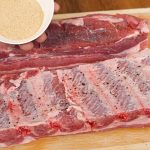 Začněte tím, že si vepřová žebra osušíte pomocí papírových kuchyňských utěrek. Poté je odblaňte ostrým nožem a okořeňte ze všech stran sušeným česnekem, solí a mletým pepřem.