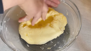 Ke hmotě nakonec přisypejte 300 gramů kukuřičného škrobu a zapracujte ho do hmoty, abyste vytvořili soudržné a hutné těsto. Nakonec přisypejte také prášek do pečiva a znovu směs velmi dobře promíchejte. Pak pokračujte v hnětení ručně. Výsledné těsto by mělo být soudržné a nelepivé, ale třepivé a nepříliš pružné.
