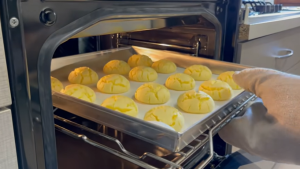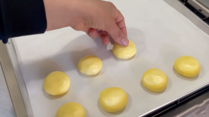 Z těsta odebírejte malé kousky o velikosti vnitřního důlku v dlani, formujte z nich kuličky a ty vyskládejte na připravený plech. Každou kuličku pak mírně rozplácněte. Když je plech plný, vložte ho do horní úrovně rozehřáté trouby. To je důležité, aby na sušenkách vznikly specifické ozdobné praskliny. Pečte sušenky po dobu 20 minut, během kterých vyběhnou nahoru a na povrchu popraskají. Poté přemístěte plech naopak do spodní části trouby a pokračujte v pečení dalších 5 až 10 minut.