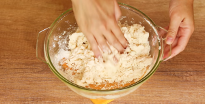 Do hrnku nalijte kefír, vsypte do něho cukr a jeden vaječný žloutek a vidličkou prošlehejte dohladka. V hluboké míse smíchejte přes jemné sítko prosátou hladkou mouku s práškem do pečiva a špetkou soli a všechny tři suché přísady důkladně promíchejte. Pak k nim přidejte studené máslo rozkrájené na kostičky a rukama ho začněte v mouce drtit, abyste vytvořili hrudkovitou sypkou směs. Přilijte k ní studené mléko a lžící smíchejte do drobivé směsi. Začněte ji hníst rukama a vytvořte hladké, soudržné a nelepivé těsto (pracujte dostatečně rychle, aby se máslo nezačalo rozpouštět, těsto by pak ztratilo svou křehkost). Hotové těsto vložte do igelitového sáčku a nechte ho 15 minut odpočívat v lednici.