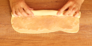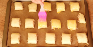 Vychlazené těsto rozdělte na dvě poloviny a každou vyválejte na obdélník silný asi 4 milimetry. Potřete ho po celé ploše vaječným bílkem a rozetřete na něj polovinu jablečné směsi. Z delší strany stočte těsto do pevné roličky a rozkrájejte ji na kousky široké asi 4 centimetry. Totéž pak udělejte i s druhou polovinou těsta a jablečné náplně.