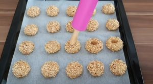 Do každé kuličky udělejte rukojetí širší vařečky nebo válečku důlek, kulička se tím zároveň o trochu zploští. Rozehřejte troubu na 160 °C a pečte sušenky, dokud nebudou zespod zlatavé.