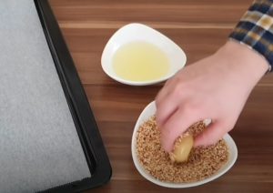 Vyložte si plech pečicím papírem a na talířek nasypejte sekané lískové ořechy. Každou kuličku namočte z jedné poloviny do bílku v mističce, který jste si předtím odložili. Pak ji ponořte do ořechů, aby se na kuličku přichytily, a dejte ji na plech.